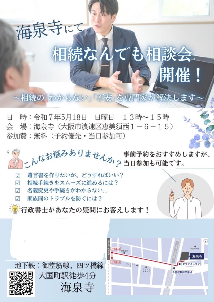 浪速区海泉寺様で相続なんでも無料相談会を開催します。